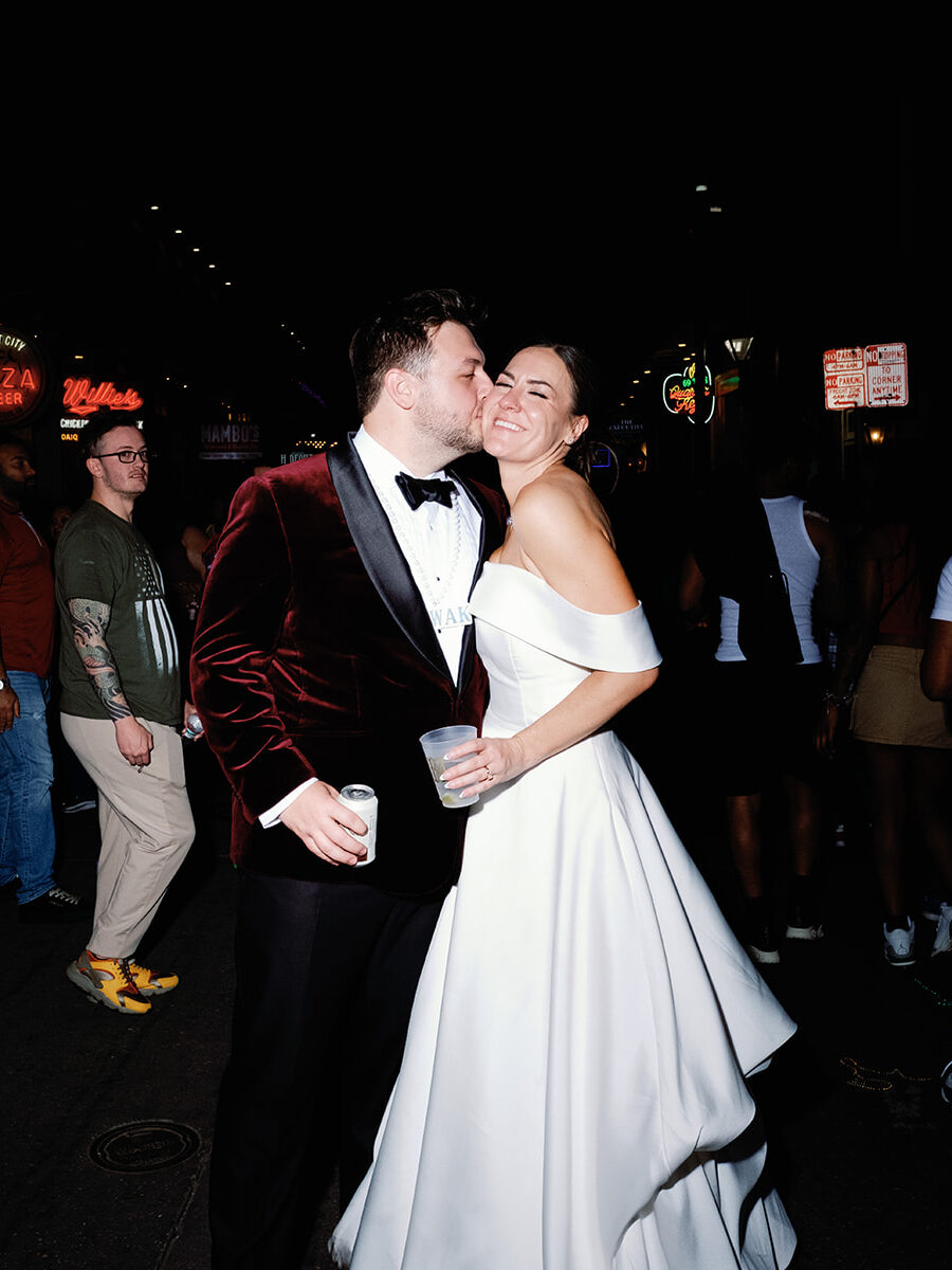 After the ceremony, we ventured into the French Quarter for portraits that fully embraced the energy of New Orleans. Bourbon Street was buzzing, and Kendall and Miles were total stars. We paused for a few epic shots with the colorful chaos of Bourbon as their backdrop complete with cheering strangers, cocktails in hand. It was the perfect mix of elegance and spontaneity that defines a true New Orleans wedding.